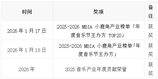 2025-2026 MBIA小鹿角产业榜单「年度音乐节主办方 TOP20」、2025-2026 MBIA 小鹿角产业榜单「年度音乐节主办方」、2025音乐产业年度贡献荣誉